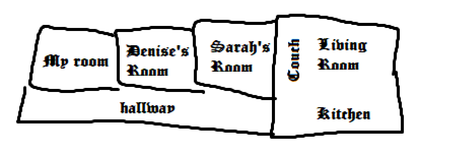 Before I go on- it is important to demonstrate the floor plan of the apartment (please refer to the labels in the style of “Old English MS”):